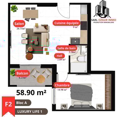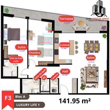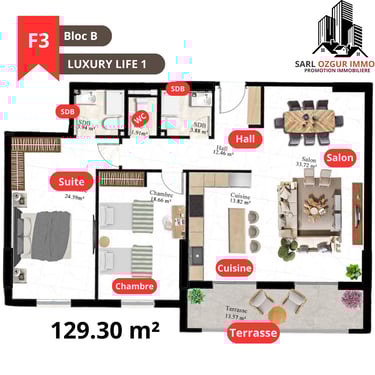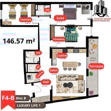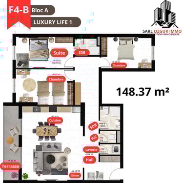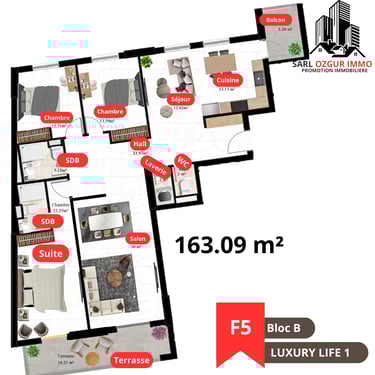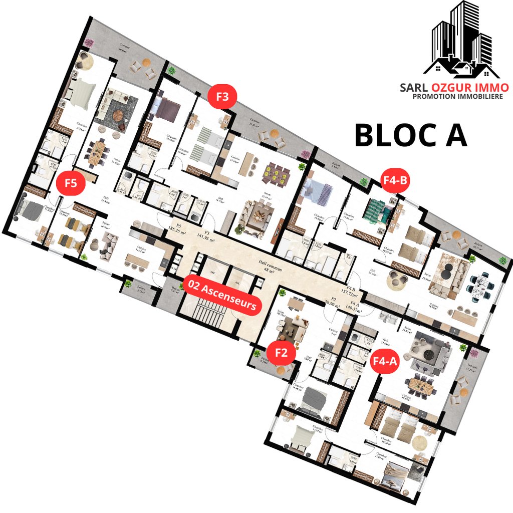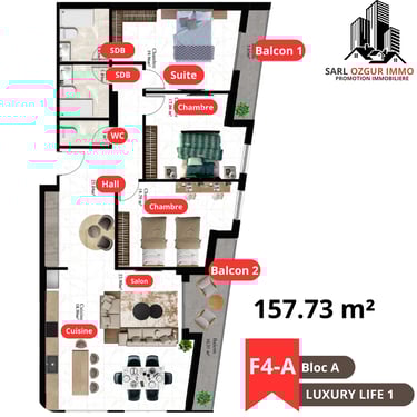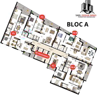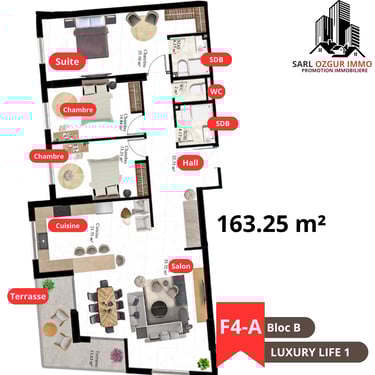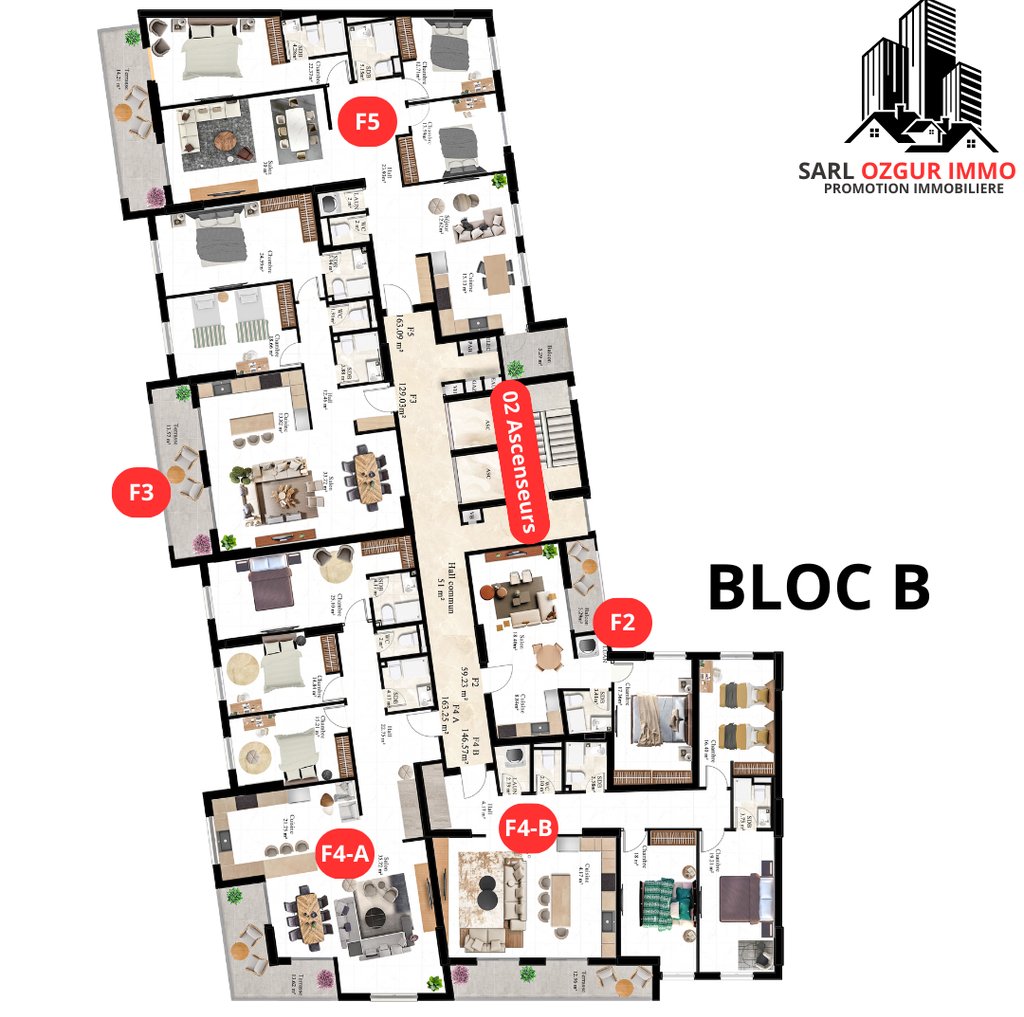 OZGUR IMMO PROMOTION vous propose la résidence LUXURY LIFE 1, située dans la commune de Belgaid dans un emplacement calme et proche de la mer. Un immeuble constitué de 120 logements en 12 étages, réparties en 02 blocs, chaque étage est constitué de 10 appartements.