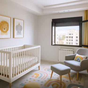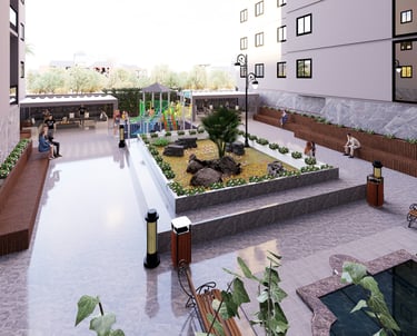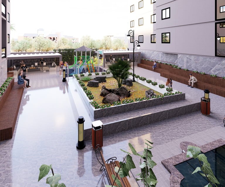 Un espace commun ensoleillé, moderne, organisé et confortable doté d’un jardin, de sièges de détente et de jeux d’enfants.